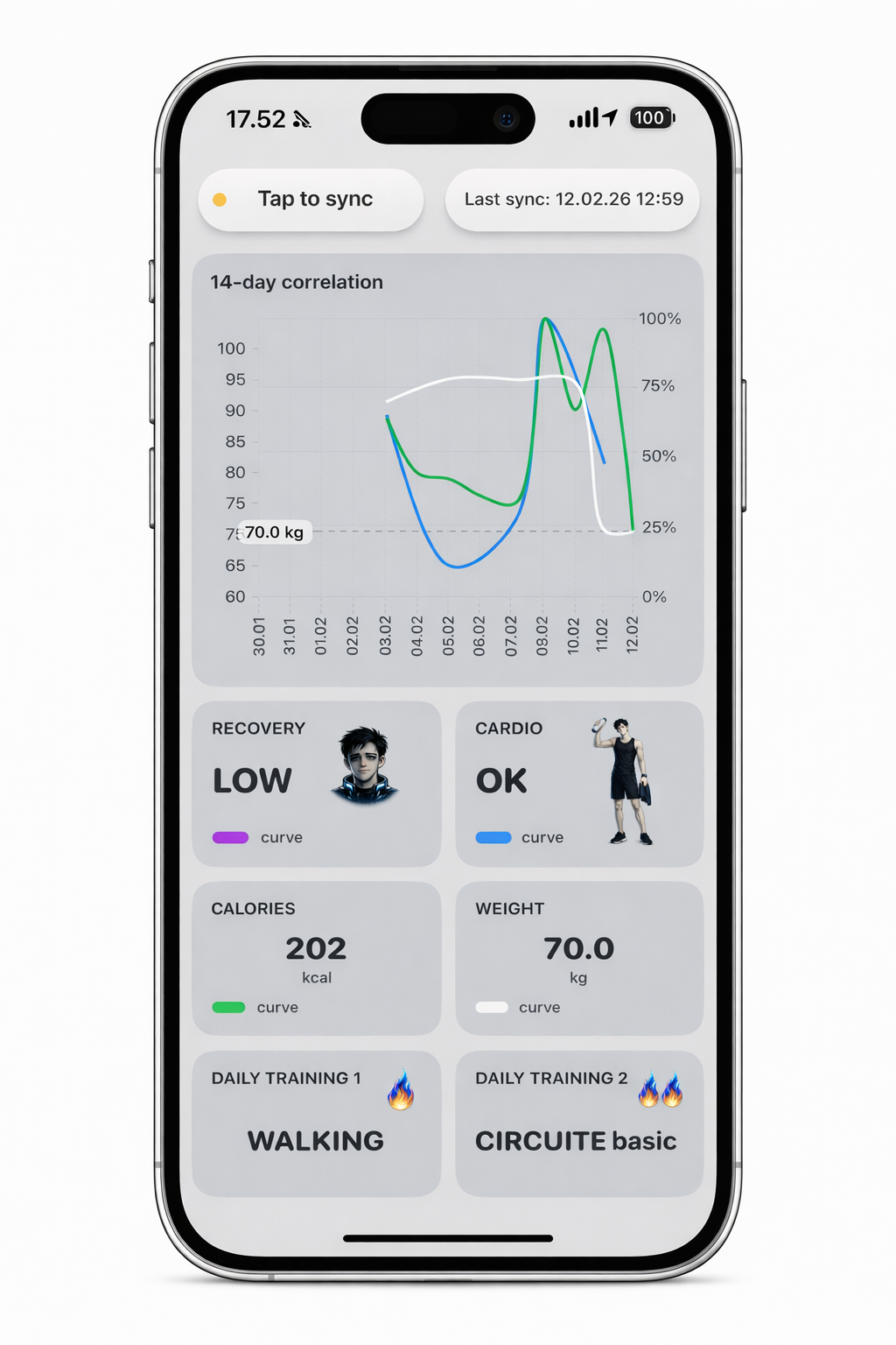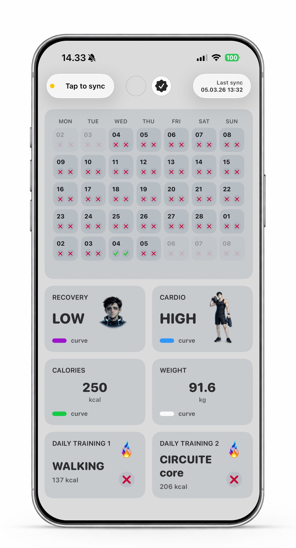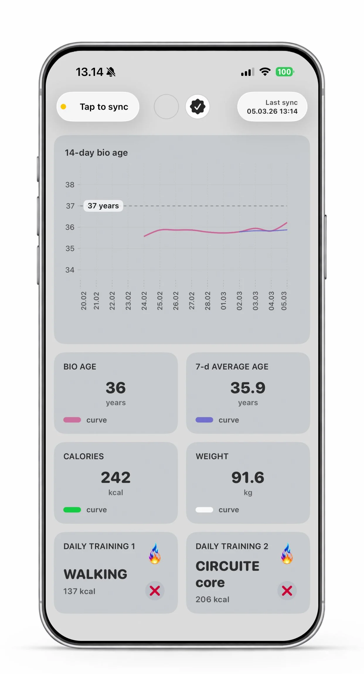 In the training calendar, you can see the intensity of each completed workout. On the iPhone dashboard, the bio age graph shows how your training and recovery affect your biological age over time.