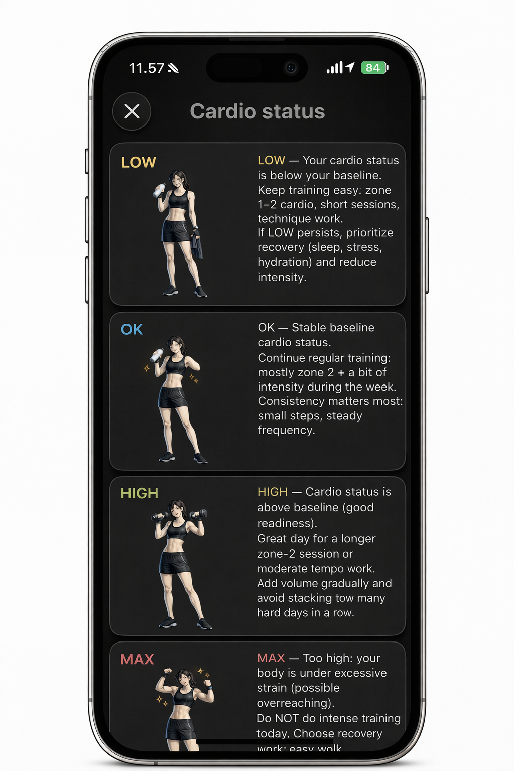 App tracks and analyzes the intensity of your workouts using Apple Watch data. Each workout is summarized into one of four simple intensity levels: Low, OK, High, or Max.